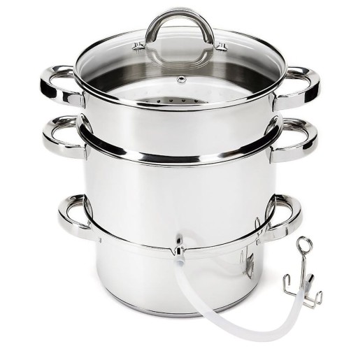 Sokownik to produkt, który wykorzystuje metodę parową. Sprawia ona, że owoce stają się miękkie i łatwiej oddają swój naturalny sok. Ten z kolei zostaje sprawnie odprowadzony do osobnego naczynia dzięki piętrowej konstrukcji tego modelu.Zaprezentowany sokownik został wyposażony w poręczny wężyk, dzięki któremu możesz skosztować tego pachnącego latem napoju. Jego nadmiar wygodnie przelejesz do dzbanka lub przygotowanych wcześniej szklanych butelek lub słoiczków aby w domowej spiżarni czekały one na sezon jesienno-zimowy. Sokownik wykonany jest ze stali nierdzewnej dzięki czemu jest higieniczny i łatwo się go czyści. Solidna stalowa konstrukcja sprawi,że sokownik posłuży nam długie lata.