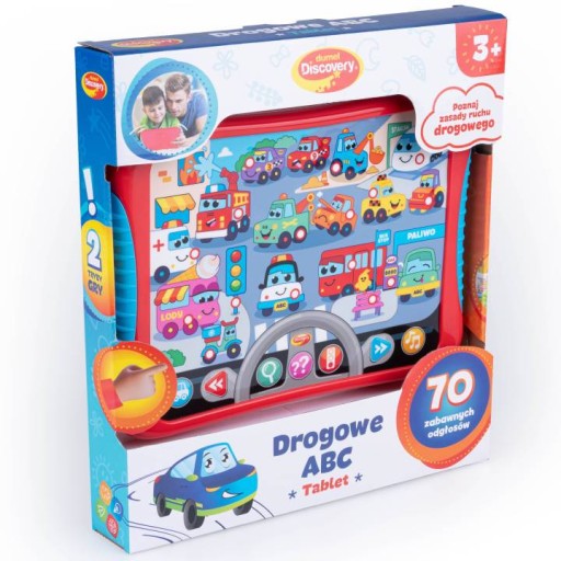 Razem z edukacyjnym tabletem poznawaj pojazdy i zasady ruchu drogowego!Edukacyjny tablet w przystępny sposób zapozna maluchy z zasadami ruchu drogowego i opowie im o różnych pojazdach, które spotkać można na drodze. W trybie Gra na najmłodszych czeka wycieczka po mieście, podczas, której ich zadaniem będzie naciskać odpowiednie przyciski na zabawce. W trybie quiz, tablet wypowiada rymowane zagadki, a odpowiedź na nie także kryje się wśród obrazków widocznych na tablecie. Zabawę umilą realistyczne odgłosy i aż 7 wesołych melodii. Tablet został wyposażony w regulację głośności oraz przełącznik On/Off.Zabawka przeznaczona jest dla dzieci od 3 roku życia.Cechy produktu:zabawka mówi po polsku,tryb gra (ruszaj na wycieczkę i naciskaj odpowiednie przyciski),tryb quiz (słuchaj zagadek i wskaż prawidłową odpowiedź),tryb dźwięki,tryb melodie (7 wesołych melodii),70 zabawnych odgłosów,zasady bezpieczeństwa na drodze,przełącznik On/Off,regulacja głośności,baterie: 3 x AAA (zawarte w zestawie),wiek: 3+.