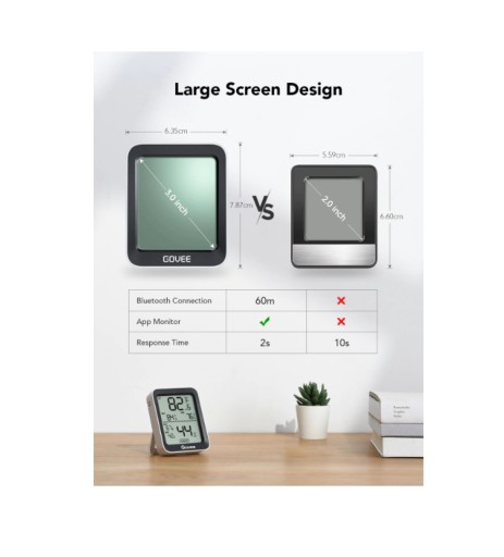 Monitoruj temperaturę i wilgotność w dowolnym pomieszczeniu za pomocą termometru higrometrowego Govee. Bądź na bieżąco z danymi dotyczącymi temperatury i wilgotności w dowolnym momencie.