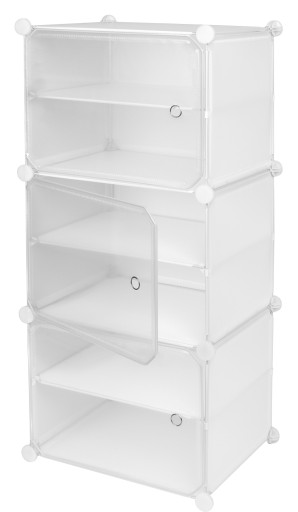 Szafka Pola pozwoli Ci zachować porządek z Twoim obuwiem. Chroni zawartość komór przed kurzem, jest wodoodporna i łatwa w utrzymaniu w czystości. Niewielkie rozmiary i modułowa konstrukcja sprawia, że model doskonale nada się jako uzupełnienie garderoby. Każda komora posiada dwie półki, w których bez problemu zmieścisz obuwie czy garderobiane dodatki. Jeśli chcesz mieć większą komorę, po prostu nie montuj półki. Wszystko zależy od Twojej wyobraźni. Przezroczyste okienka ułatwiają identyfikację obuwia w poszczególnych komorach. Drzwi w szafce można montować lewostronnie i prawostronnie. Każda z półek wykonana jest z metalowego stelażu i wodoodpornego materiału. Montaż szafki jest łatwy i zajmuje niewiele czasu. Wystarczy połączyć poszczególne półki łącznikami z tworzywa ABS. Modułowa konstrukcja szafki Pola pozwoli Ci puścić wodze fantazji i skonstruować szafkę na buty o różnych kształtach i wymiarach. Wystarczy połączyć kolejne moduły ze sobą, by stworzyć garderoby i szafki na obuwie o dużych rozmiarach.