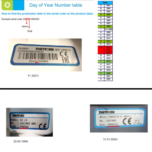 Aby dobrać odpowiedną uszczelkę do swojej kasety toalety sprawdź model oraz rok produkcji. Na ostatnim zdjęciu podajemy schemat z opisem roku produkcji na różnych etykietach Thetford. Etykieta znajduję się najczęściej na spodzie kasety, na drzwiczkach od toalety lub na ścianie toalety tam gdzie wkładamy kasetę.