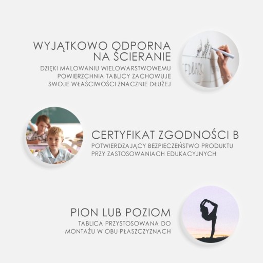 Natomiast właściwości magnetyczne dają możliwość umieszczania na tablicy rysunków, plakatów i ogłoszeń za pomocą magnesów.