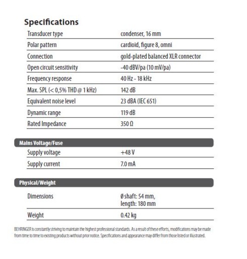 - Przełączalne charakterystyki: kardioidalna, dookólna lub ósemkowa