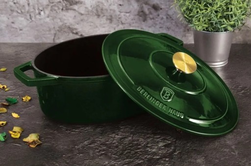 Brytfanna żeliwna 32cm o pojemności 5,56l z pokrywą. Z zewnątrz pokryta emalią w kolorze zielonym. Linia naczyń Emerald Strong Mold.