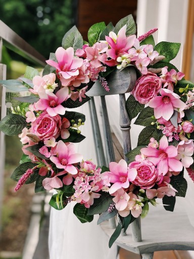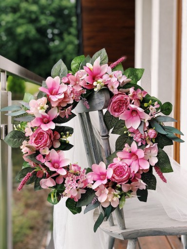 Piękny wianek, ozdobiony sztucznymi kwiatami w różowych odcieniach oraz różnorodnymi dodatkami i liśćmi.