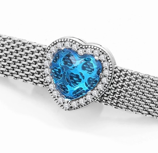 Dookoła wysadzany bezbarwnymi cyrkoniami sześciennymi a w centralnej części błękitny fasetowany kryształ w kształcie serca formuje się w olśniewającego charmsa.