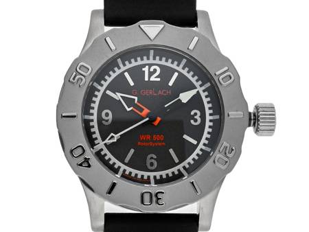 G. GERLACH BATHYSCAPHE to model zegarka otwierający nową linię – zegarków w ponadczasowej stylistyce typu diver. Zegarek dzięki dobrze dobranej wielkości (44mm) i wyraźnych liniach jest doskonały do noszenia przy każdej okazji. Doskonale znany i sprawdzony mechanizm NH35A został dostarczony przez TMI/Seiko Corp. Mechanizm ma 24 kamienie, stop-sekundę, ręczne dokręcanie i rezerwę chodu powyżej 40 godzin. Zegarek ma wodoodporność 500m. Jak zawsze w zegarkach G. GERLACH odnajdziecie szafirowe szkiełko pokryte warstwą antyrefleksyjną.