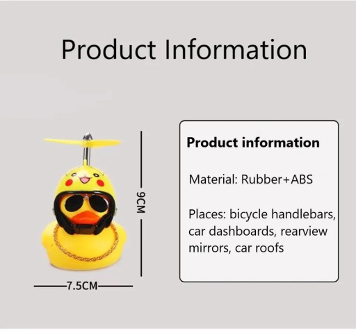 Wyróżniająca się z tłumu, żółta kaczuszka wyposażona w kask, śmigło, okulary oraz łańcuszek to rewolucyjny produkt dla miłośników rowerowej przygody. Dzwonek rowerowy w kształcie uroczego kaczego stworka to nie tylko ciekawy dodatek do roweru, ale również element poprawiający widoczność na drodze. Lampka jest wykonana z wytrzymałego materiału, wodoodpornego na warunki atmosferyczne, co gwarantuje trwałość i długotrwałe użytkowanie.