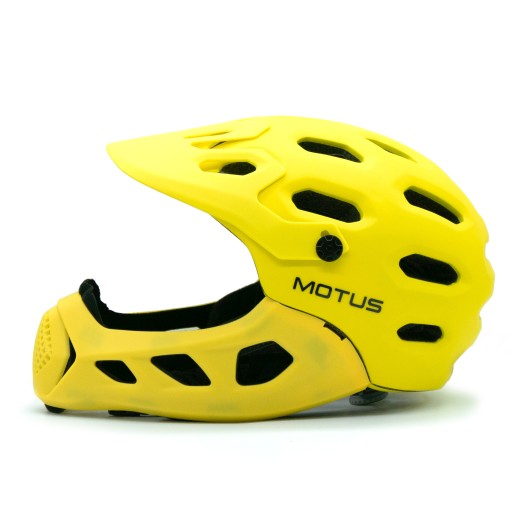 Kask rowerowy Motus posiada 21 otworów wentylacyjnych, co pozwala na swobodny przepływ powietrza hamując nadmierne pocenie. Dodatkowa osłona podbródka chroni również szczękę przed urazami. Mechanizm wypinania osłony pozwala stworzyć dwa różne kaski: do MTB, BMX, hulajnogi, roweru górskiego i dirtowego.