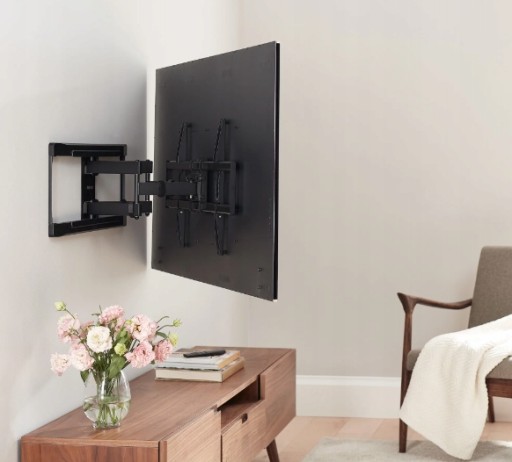 Uchwyt umożliwia regulację kąta widzenia telewizora. Można go obracać w lewo lub prawo, nachylać do góry lub w dół, istnieje również możliwość wysunięcia telewizora z pozycji podstawowej. Uchwyty ruchome są idealne w przypadku, gdy chcesz móc dostosować kąt oglądania telewizora z różnych miejsc w pomieszczeniu .