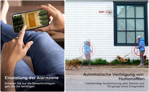 Zewnętrzna kamera monitorująca jest wyposażona w zaktualizowaną funkcję automatycznego śledzenia osób, która może automatycznie śledzić ruch człowieka. Rejestruje zdarzenia bardziej precyzyjnie niż kamera wykrywająca tylko ruch, redukując liczbę fałszywych alarmów. Dzięki możliwości pochylenia o 350° i obrotu o 108° można również ręcznie obracać obiektyw z telefonu, aby monitorować każdy zakątek i uzyskać panoramiczny widok!