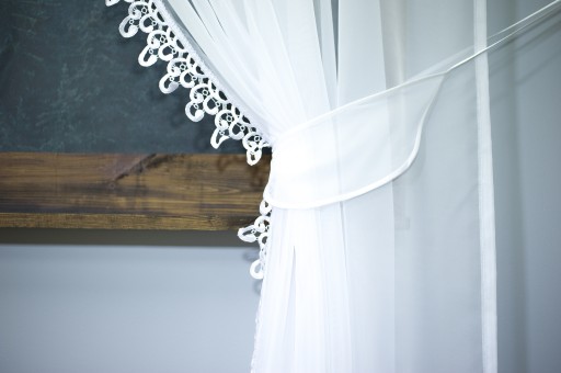 Boki wewnętrzne firany wykończone koronką około 8 cm.