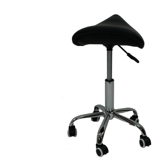 Ergonomiczny taboret kosmetyczny w kolorze czarnym z profilowanym siedziskiem w kształcie siodła to produkt, który dba o stan twoich stawów i kręgosłupa wymuszając prawidłową postawę ciała podczas pracy. Wyprofilowane siedzisko pozwala na wielogodzinna pracę bez dyskomfortu.