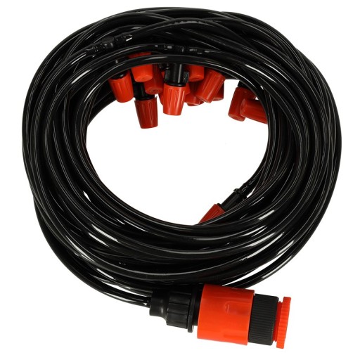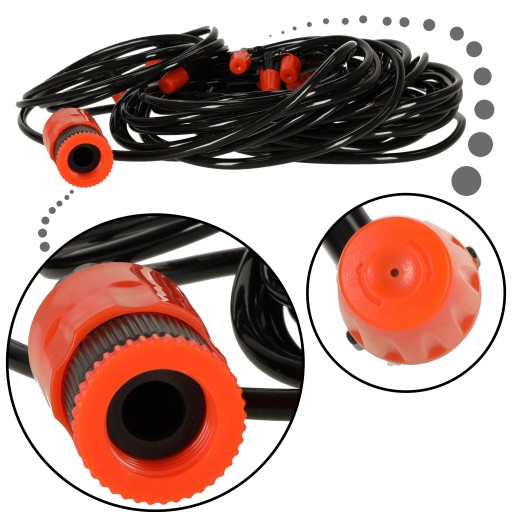 Cały zraszacz ma długość 20 metrów oraz posiada 20 dysz rozmieszczonych w odstępach jednometrowych - dzięki temu wodna mgiełka ma naprawdę spory zasięg. Co więcej, w razie potrzeby wąż można przyciąć do potrzebnej długości, co umożliwia modyfikowanie odległości pomiędzy dyszami.