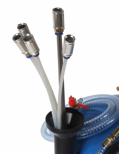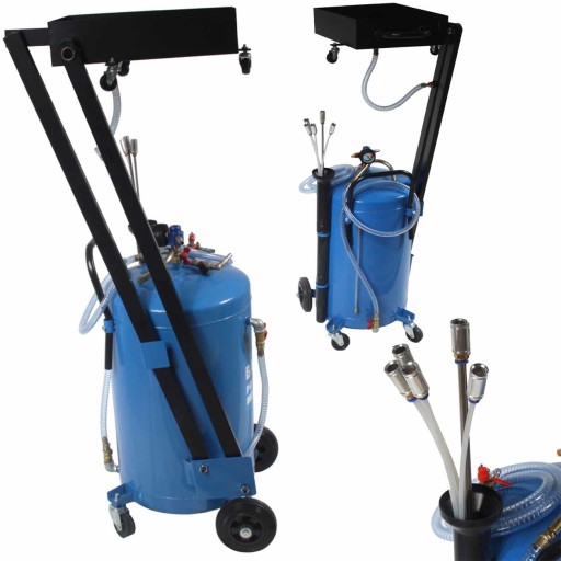 Urządzenie do opróżniania oleju z silników, skrzyń biegów i dyferencjałów wszelkiego typu pojazdów, z pneumatycznym opróżnianiem zbiornika przepracowanego oleju.