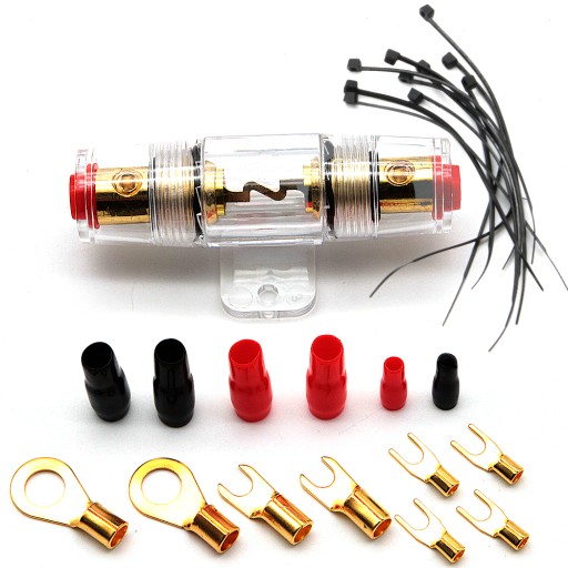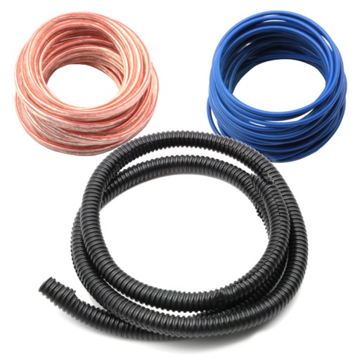 Zestaw przewodów do zamontowania wzmacniacza w samochodzie. W zestawie znajdują się przewody zasilające, sygnałowe, przewód sterujący, oprawka z bezpiecznikiem i akcesoria. Zestaw umożliwia szybką i profesjonalną instalację wzmacniacza.