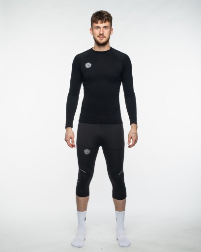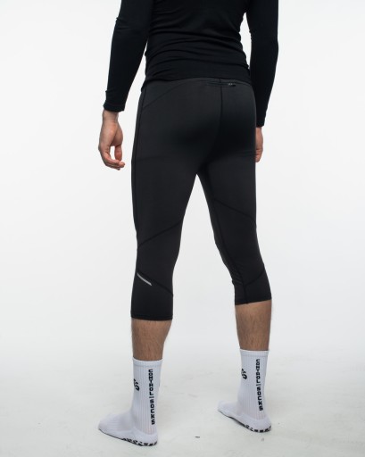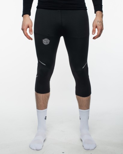 Legginsy męskie, długość nogawek do kolan. Elastyczny ściągacz w pasie z regulowanym sznurkiem. Elementy odblaskowe. Tylna kieszeń zapinana na zamek.