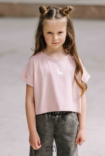 KOSZULKA Z WILKIEM TYPU CROP TOP W KOLORZE PUDROWEGO RÓŻU. RĘKAWEK PODWINIĘTY.