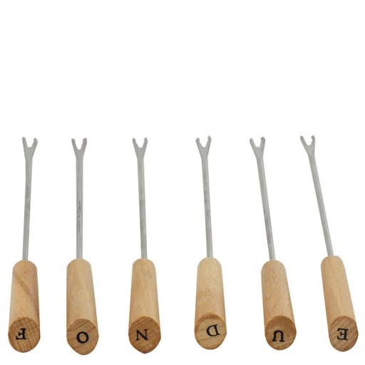 ** 6 stalowych widelczyków, oznaczonych literami ze słowa "fondue"