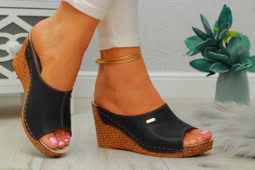 Damskie klapki w kolorze czarnym na wysokim koturnie z ozdobnym szwem na podbiciu. Idealnie sprawdzą się jako obuwie codzienne. Z łatwością dopasują się również do eleganckich stylizacji. Profilowana, skórzana wkładka. Szyta podeszwa skutkuje dłuższą wytrzymałością obuwia.