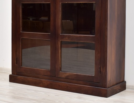 Witryna kolonialna, dwuskrzydłowa, ręcznie wykonana w Indiach z litego drewna palisandru indyjskiego. Witryna oszklona od frontu, po bokach zabudowana litym drewnem, wyposażona w 5 półek, wybarwiona w ciemnym odcieniu brązu, wykończona pięknymi gzymsami.