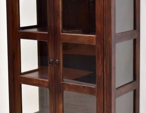 Witryna kolonialna, dwuskrzydłowa, ręcznie wykonana w Indiach z litego drewna palisandru indyjskiego. Witryna oszklona od frontu i po bokach, wyposażona w 5 półek, wybarwiona w ciemnym odcieniu brązu, wykończona pięknymi gzymsami.