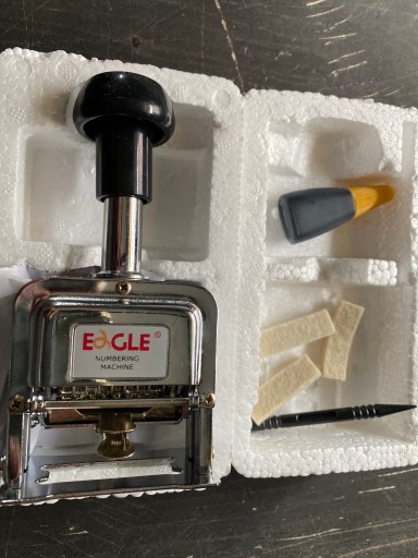 Numerator Eagle_- numerator automatyczny w mocnej niezawodnej obudowie_- wyposażony w plastikowy ergonomiczny uchwyt_- dostępny w modelu 6- , 7-, lub 8 - cyfrowym_- wysokość czcionki 4 mm_- posiada wkład samotuszujący_- jednostka sprzedaży 1 sztuka