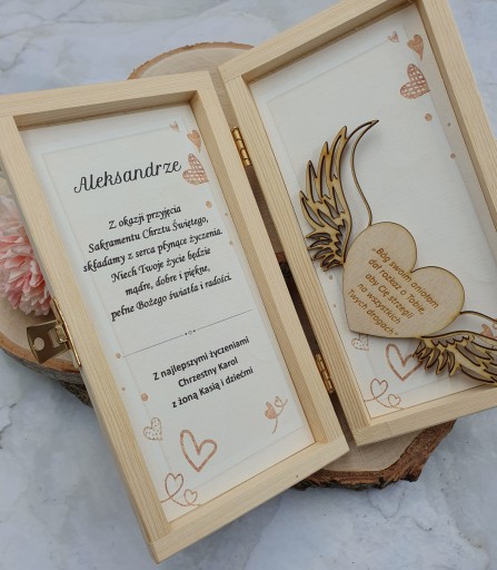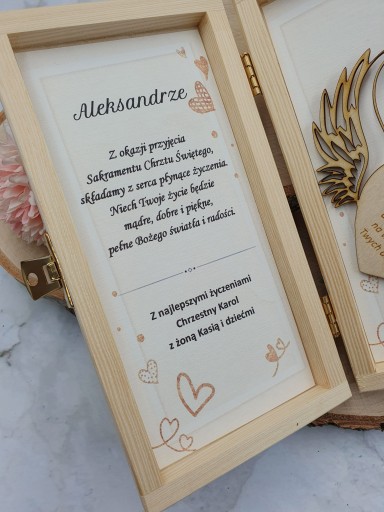Pudełko zawiera imię dziecka jak i również osób wręczających prezent. Do wyboru maja Państwo również dużą ilość życzeń. Można przesłać własne.
