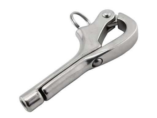 Zapięcie pelikan, wykonane ze stali kwasoodpornej A4, AISI 316. Do połączenia z końcówką ściągacza z gwintem prawym M8 (do nabycia osobno kod 00336). Zastosowanie na jachtach żaglowych np: do zakończenia linek relingów.