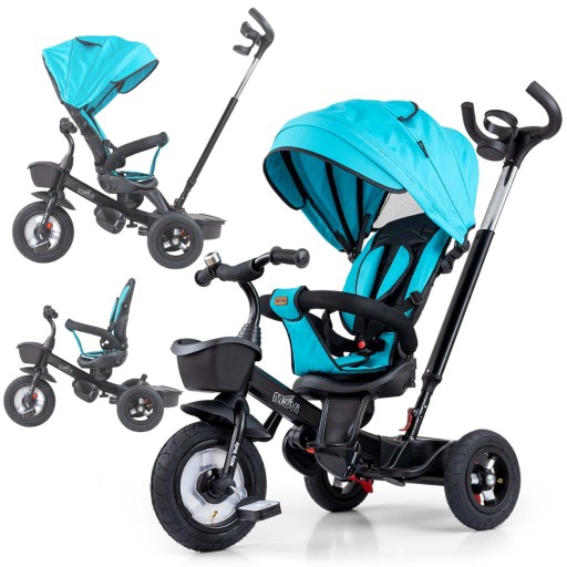 MOVI jest stabilny i bezpieczny, posiada nowoczesną konstrukcję, wygodne wyprofilowane obracane o 360 stopni siedzisko, które umożliwi podróż przodem lub tyłem do kierunku jazdy. Rowerek został wyposażony w barierkę zabezpieczająca dziecko przed wypadnięciem, trzypunktowe pasy bezpieczeństwa oraz podnóżki a pompowane koła umożliwiają cichą i komfortową jazdę.Po zdemontowaniu rączki, barierek, budki i pokrowca na siedzisko MOVI będzie służył jako rowerek trójkołowy. Dzięki funkcji „wolnego koła” dziecko może swobodnie pedałować, a kierownica dla rodzica nadal może korygować prędkość przemieszczania.