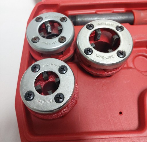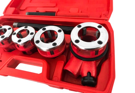 Głowice gwintownic marki Mega 67205, z nożami ze stali 9Cr2. Profesjonalny zestaw gwintownic do rur o średnicy: 3/8”, 1/2”, 3/4”, 1”, 1 ¼. Obudowa grzechotki aluminiowa, grzechotka dwukierunkowa (16 zębów). Dwuczęściowa rękojeść, zestaw spakowany w walizce.