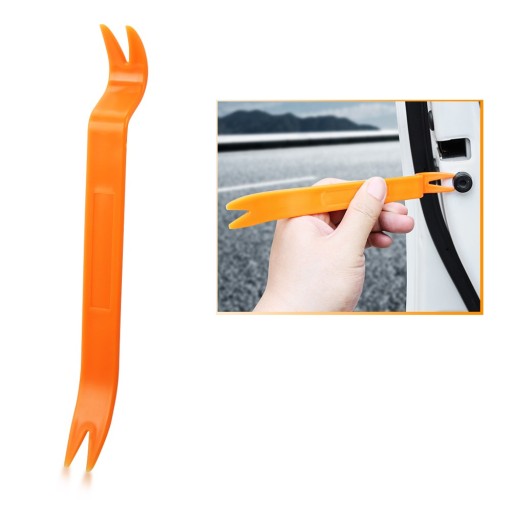 Ściągacz do spinek tapicerki. Długość 200 mm. Ściągacz służy do bezpiecznego rozpinania spinek tapicerskich używanych w łączeniu elementów wnętrza i karoserii samochodowej. Ściągacz uwalnia spinkę o konstrukcji kołka lub kołka rozporowego z otworu, wykorzystując widełkową konstrukcję końcówki roboczej oraz dźwignię ramienia.