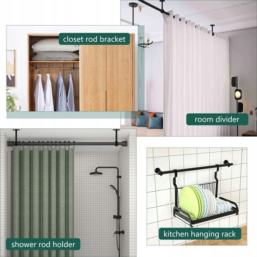 Uchwyt ścienny lub sufitowy – dwa sposoby montażu (śruby i kotwice są dołączone). Uchwyty na karnisze można zamontować na stałe jako wspornik karnisza sufitowego, który idealnie się układa i tworzy przegrodę pokojową lub jako uchwyty ścienne do karnisza do wieszania ręczników, ubrań, krawatów i innych przedmiotów.