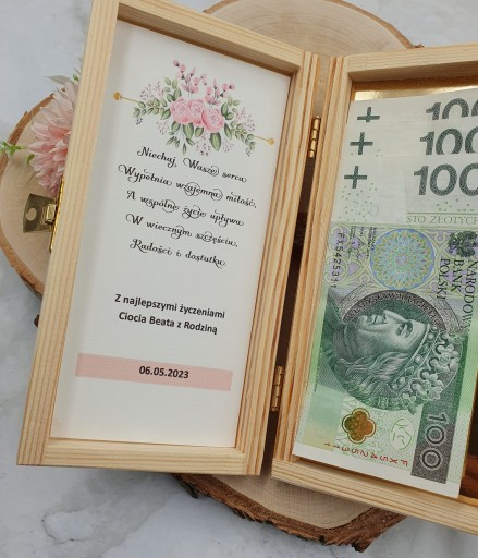 Pudełko zawiera imiona Państwa Młodych jak i również osób wręczających prezent. Do wyboru maja Państwo również dużą ilość życzeń ślubnych. Można przesłać własne.