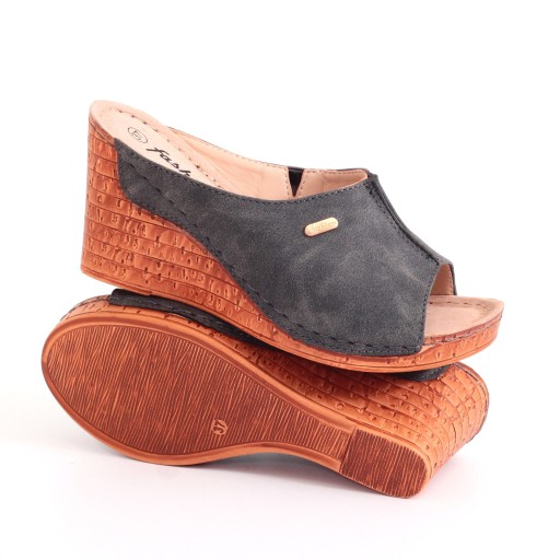 Damskie klapki w kolorze szarym na wysokim koturnie z ozdobnym szwem na podbiciu. Idealnie sprawdzą się jako obuwie codzienne. Z łatwością dopasują się również do eleganckich stylizacji. Profilowana, skórzana wkładka. Szyta podeszwa skutkuje dłuższą wytrzymałością obuwia.
