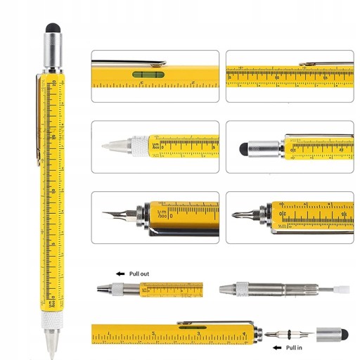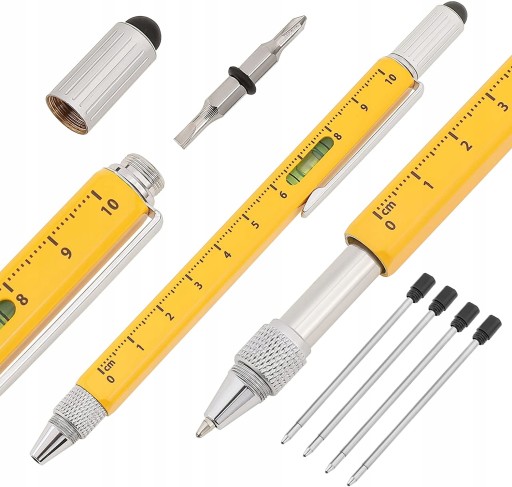 Długopis wielofunkcyjny 6 w 1: fajne gadżety dla mężczyzn posiadają 6 wielofunkcyjnych funkcji: Rysik do ekranu, poziomica, linijka centymetrowa/calowa, śrubokręt szczelinowy i krzyżakowy oraz biro. Do piór konstrukcyjnych dołączone są 4 dodatkowe wkłady, które piszą bardzo płynnie ze stałym przepływem tuszu, dając komfort pisania.