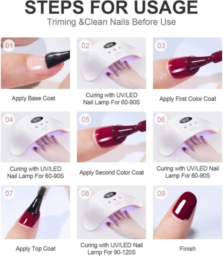 Po nałożeniu lakieru należy wysuszyć paznokcie lampą UV/LED przez 60-90 sekund.. Jeśli żel jest gęsty lub lepki, umieść go w gorącej wodzie na 1-2 minuty, wyjmij z wody i dobrze wstrząśnij.