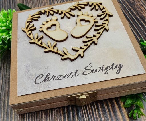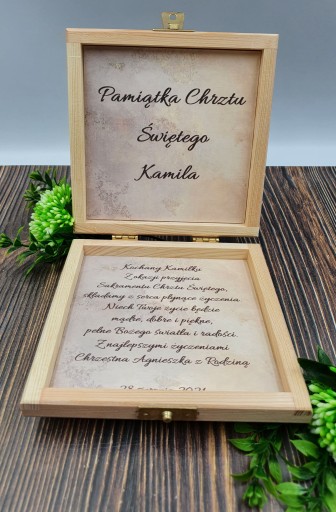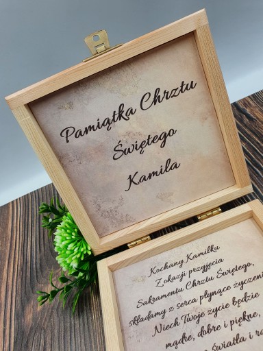 Pudełko zawiera imię dziecka jak i również osób wręczających prezent. Do wyboru maja Państwo również dużą ilość życzeń. Można przesłać własne.
