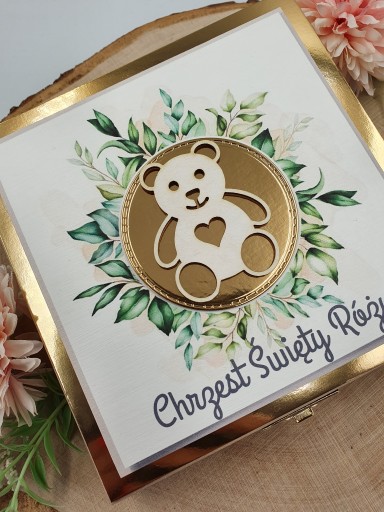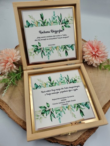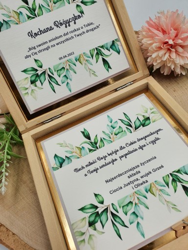 Pudełko zawiera imię dziecka jak i również osób wręczających prezent. Do wyboru maja Państwo również dużą ilość życzeń. Można przesłać własne.