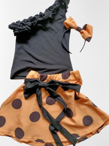 Spódniczka na gumce, miodowa w duże czarne grochy, przepasana ozdobną kokardą.