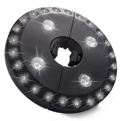 Montaż lampy nie wymaga narzędzi, uchwyt jest elastyczny, dzięki temu pasuje do różnych rozmiarów parasola.