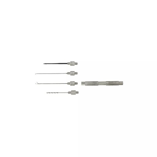 Kompletny i kompaktowy zestaw aluminiowej rączki i końcówek wyposażonych w różne igły oraz wiertło do uzbrajania przyponów karpiowych w przynęty.