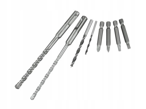 - akcesoria: szybkowymienny uchwyt wiertarski dla wierteł o okrągłym chwycie, 2 wiertła do betonu SDS (6 mm / 8 mm), 2 wiertła do drewna o okrągłym chwycie (3 mm / 5 mm), 4 wkręcane bity 50 mm (S2 / PH2 / PH1 / TX25)