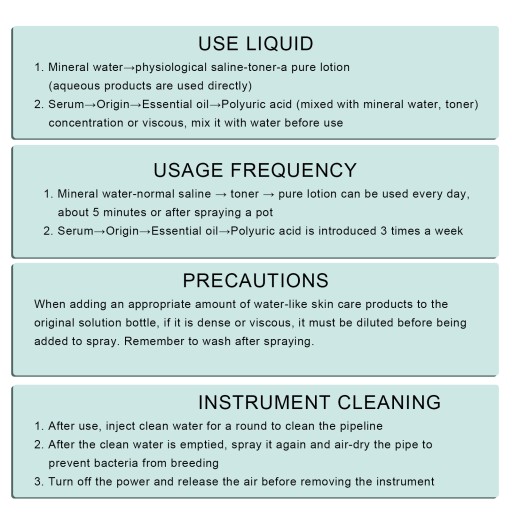 4. Można stosować z tonikiem, oryginalnym płynem, balsamem itp. W przypadku stosowania gęstszych produktów należy dodać wody mineralnej i wymieszać z wodą przed użyciem.