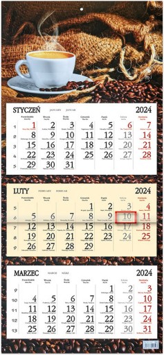 - układ: 3 miesiące na stronie (miesiąc bieżący, poprzedni i następny) w oddzielnych bloczkach.