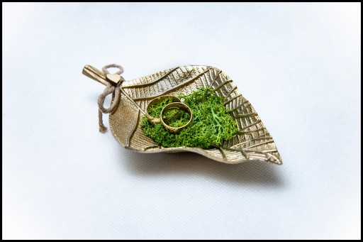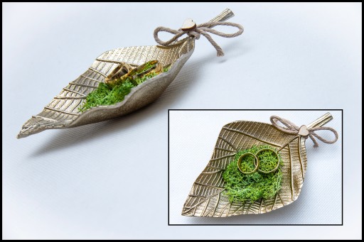 Romantyczna, tacka na obrączki w kształcie liścia w kolorze złotym.