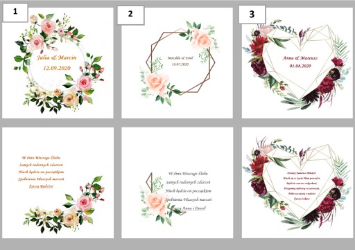 Pudełko zawiera imiona Państwa Młodych jak i również osób wręczających prezent. Do wyboru maja Państwo również dużą ilość życzeń ślubnych( Można przesłać własne) oraz 12 grafik kwiatowych.
