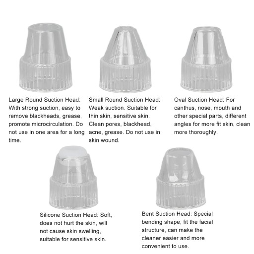 5. 4 wymienne głowice: środek do czyszczenia zaskórników z 4 wymiennymi sondami, duża i okrągła sonda z silnym ssaniem, łatwe do usunięcia zaskórniki, mała okrągła sonda może oczyścić trądzik w alarku nosa. Sonda owalna zwiększa elastyczność i jędrność skóry oraz redukuje drobne linie.