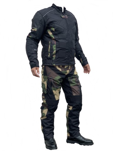Kurtka + spodnie możliwość spięcia zamkiem, wyjmowane protektory, wypinana podpinka, wstawki moro na spodniach i kurtce