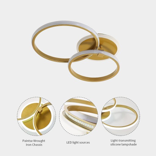 Nowoczesna, kreatywna geometria okrągła lampa sufitowa LED do kształtowania się z trzech złotych kółek , które mogą być montowane poprzecznie lub nie krzyżowo. a podstawa sufitu może również świecić. Unikalny minimalistyczny nordycki design, oświetlenie otoczenia 360°, oświetlające całe otoczenie, pierwszy wybór do dekoracji świetlnej.